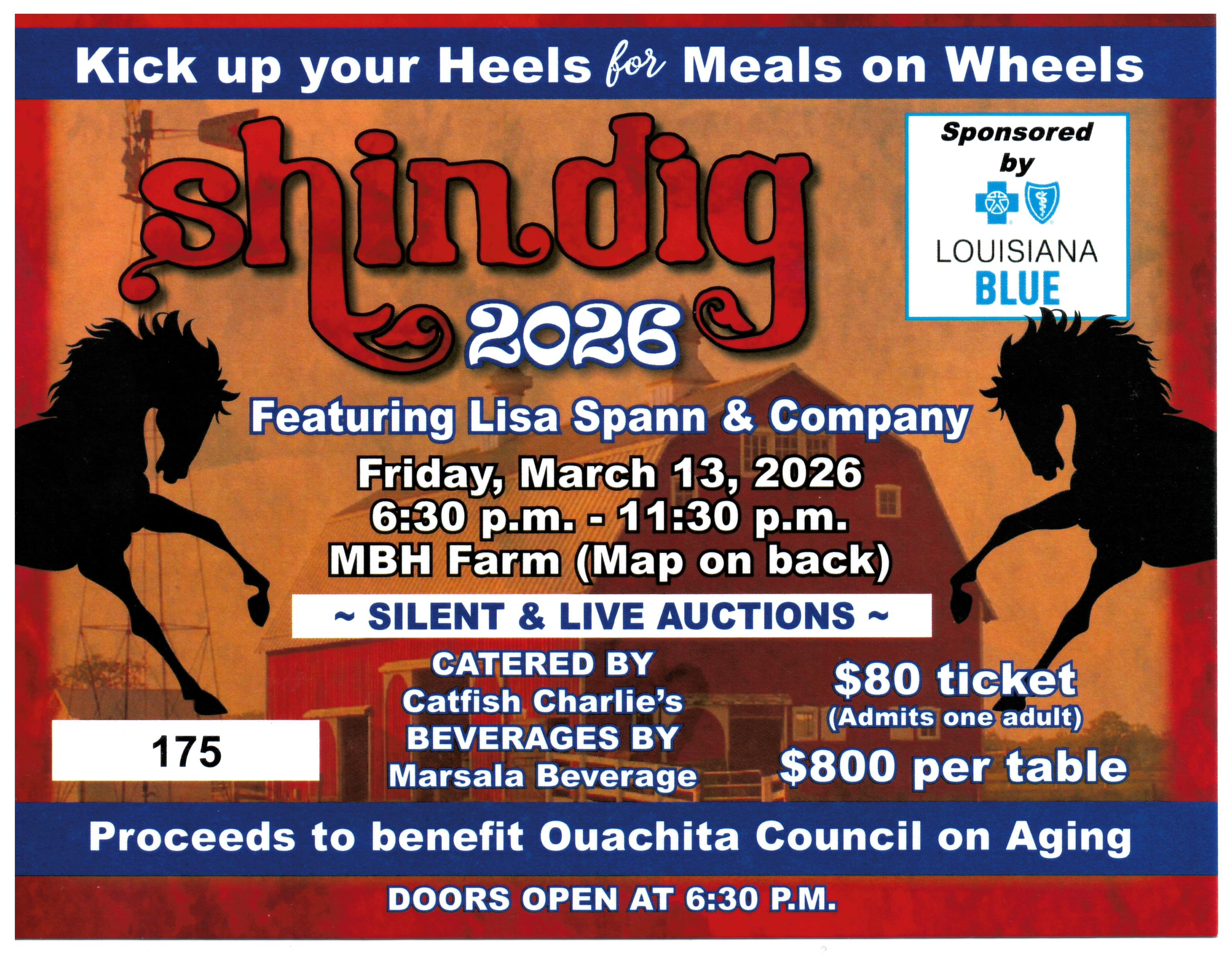 Don’t miss out on the Ouachita Council on Aging’s Annual SHINDIG! The event will be held Friday, March 13, 2026 at MBH farm 6:30 PM – 11:30.
